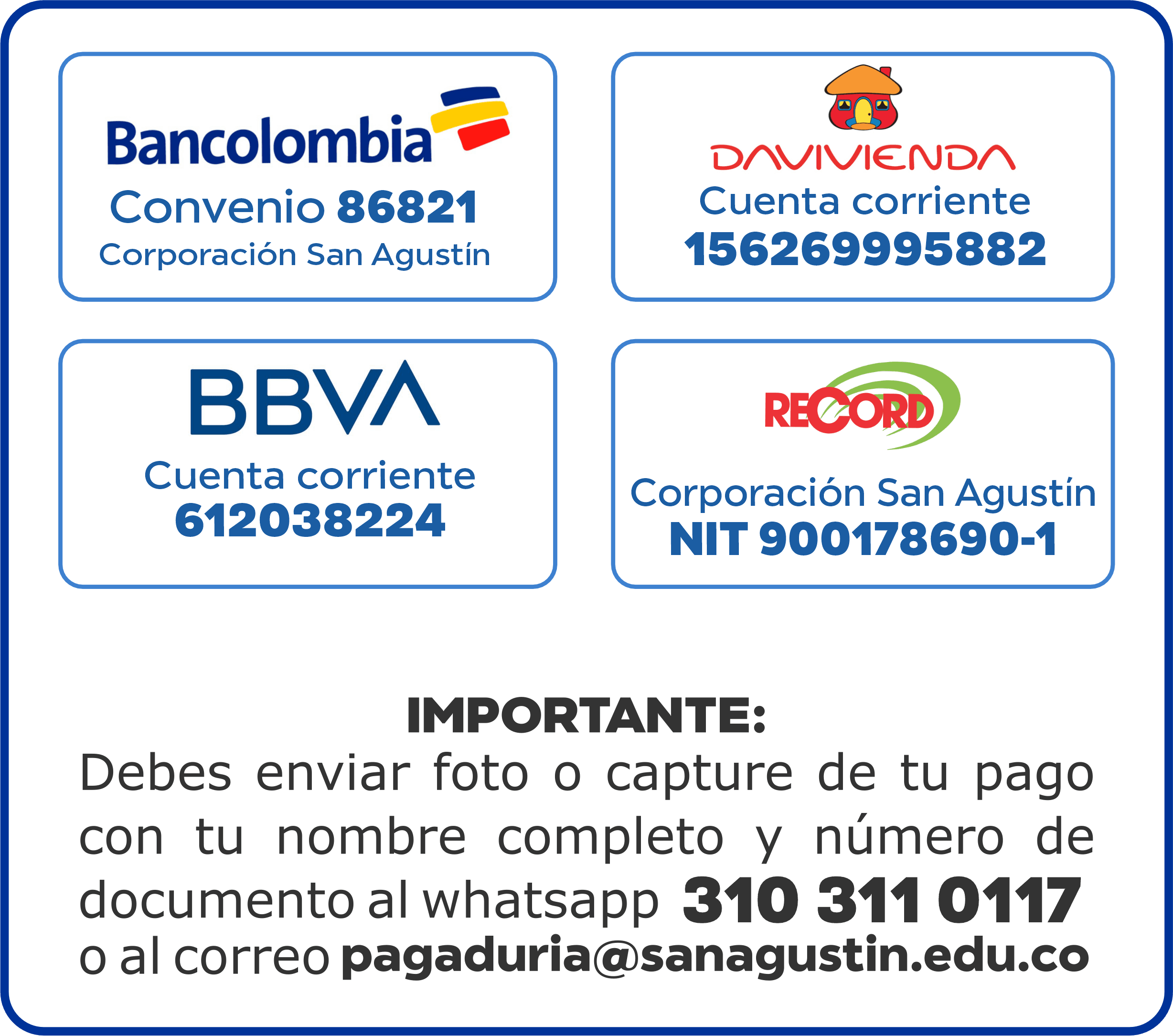 Las solicitudes respecto a la validación, legalización de pagos y formalización de matrículas deben ser dirigidos al correo pagaduria@sanagustin.edu.co