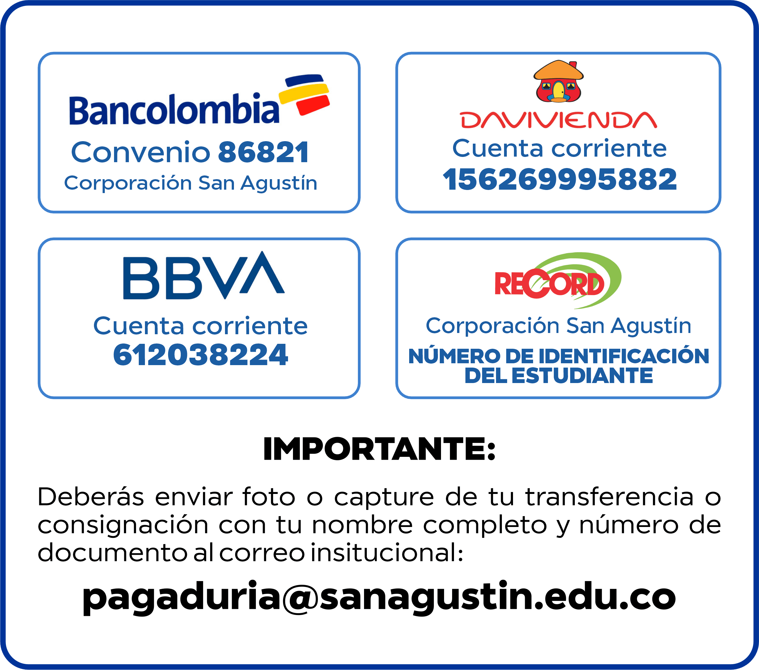 Las solicitudes respecto a la validación, legalización de pagos y formalización de matrículas deben ser dirigidos al correo pagaduria@sanagustin.edu.co
